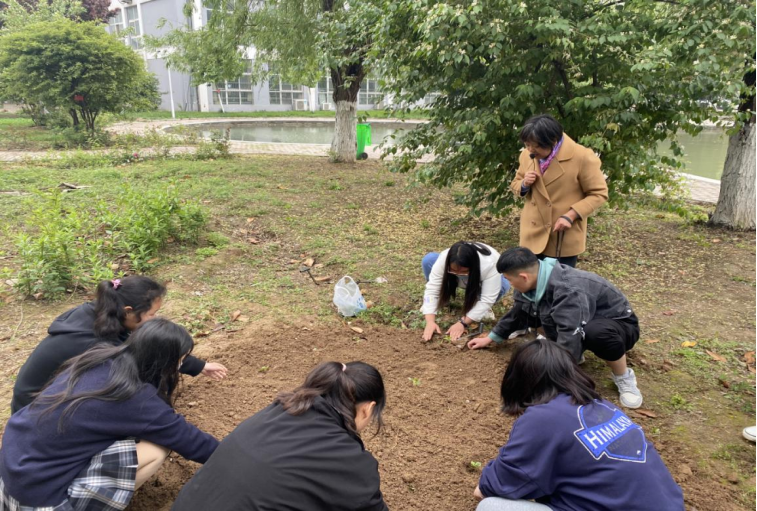 在校园里何莉老师给同学们认真讲解花卉的正确栽培方法和几种花卉的生态习性和种植方法。