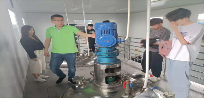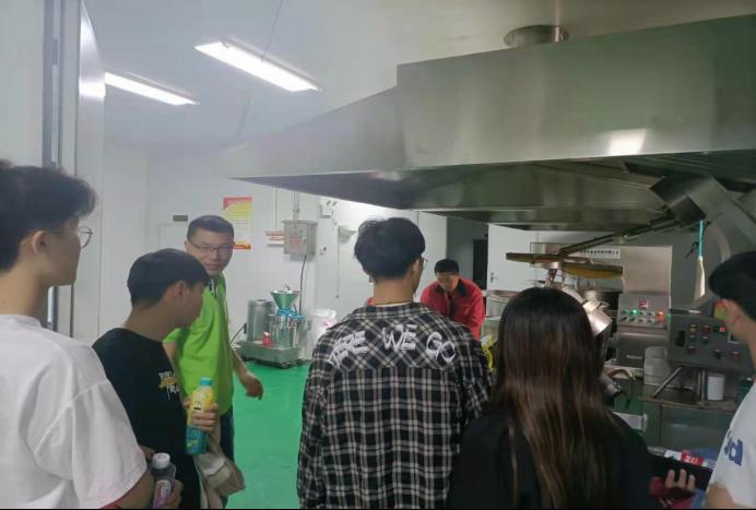 随后豆老师带领大家进入生产车间进行深度交流学习,处在生产第一线,豆老师带领大家首先回顾了课堂上所讲授的香精香料生产流程,然后针对生产实际,进行了现场教学,让同学们真正感受到了香精香料的实地生产,并针对生产加工中经常遇到的难题进行了探讨,并当场解决企业生产中遇到的问题,获得了企业的大力赞扬和同学们的认同。