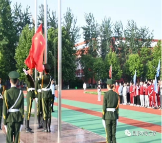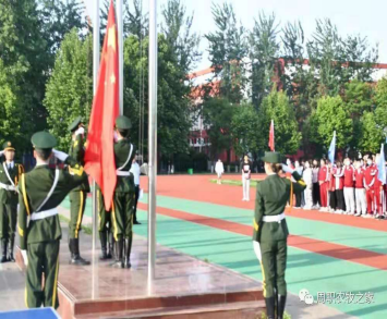 伴着庄严的国歌声,旗手缓缓升起国旗。微风阵阵,鲜红的国旗随风招展,耀眼夺目。